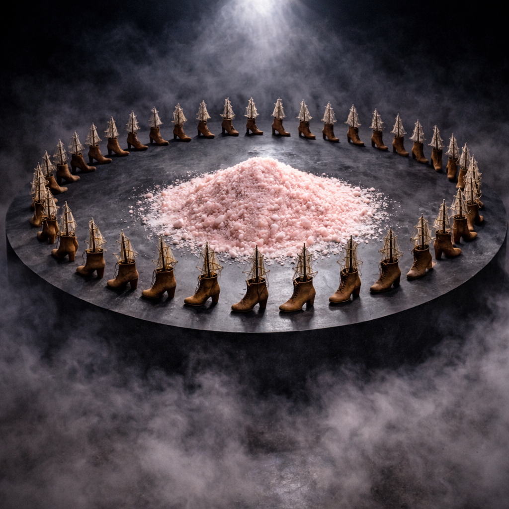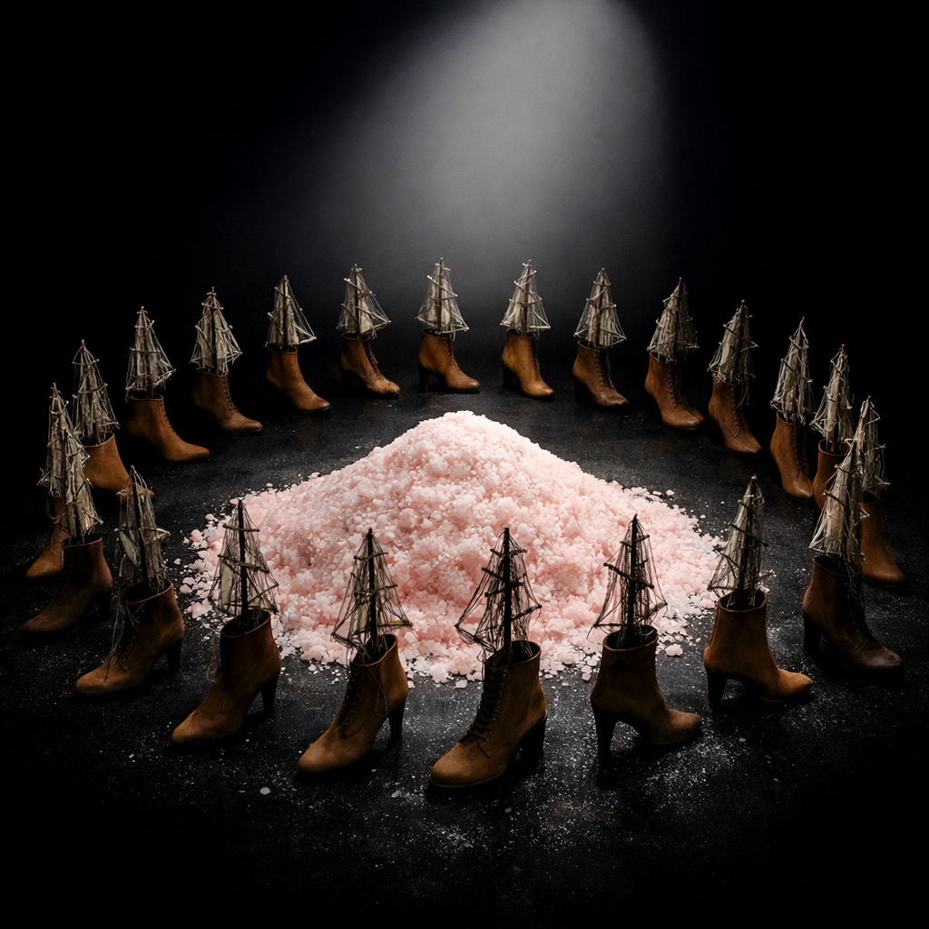 Karavelles et Rives de Sel (KÂ) is an immersive installation exploring the tension between circulation and immobility within global extractive economies. Composed of shoe molds transformed into fragile vessel-like forms, surrounded by accumulations of salt, the work evokes suspended trade routes and ghostly logistics. Salt functions both as resource and residue, an archival material recording histories of exchange, labor, and extraction. Through video projections of abstract flows, the installation reveals how bodies and materials are reduced to data within global systems. By immobilizing symbols of transport, KÂ exposes a silent geography of disruption, where movement persists as trace rather than action, inviting reflection on disconnection in a hyper-networked world.
