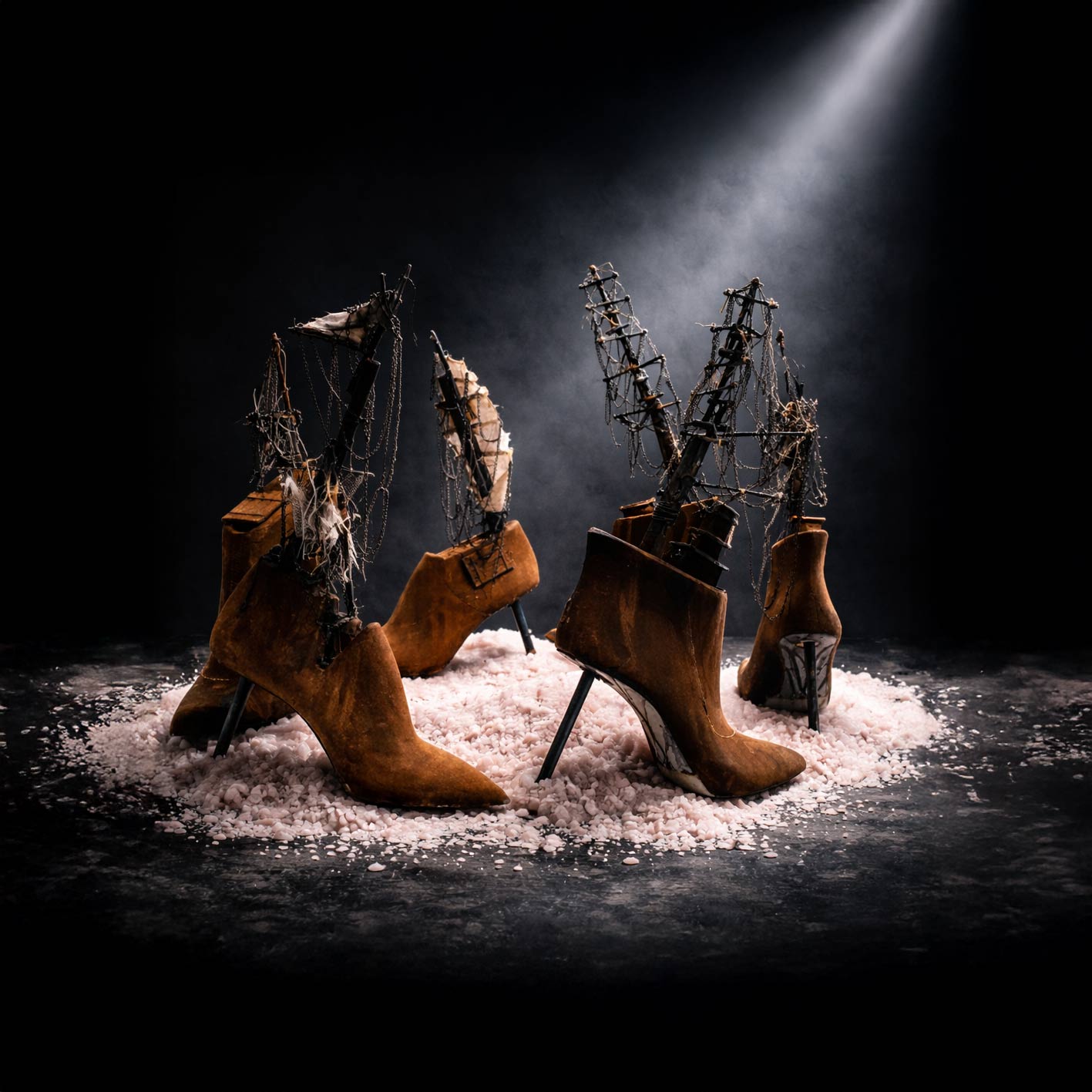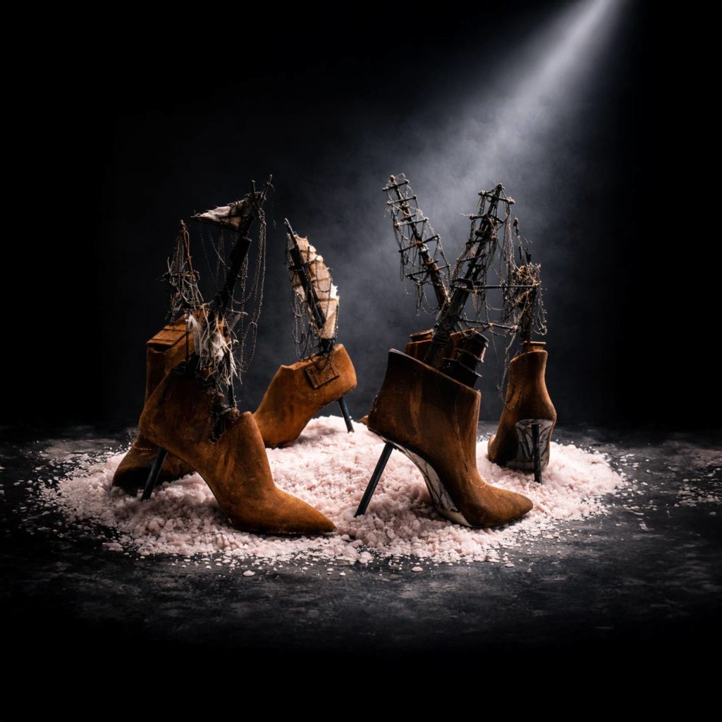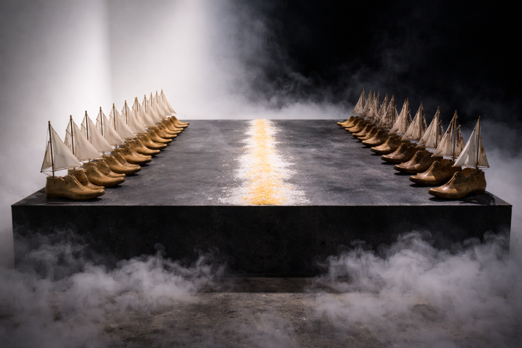 KÂ s’inscrit dans un espace liminal, à la frontière de l’inerte et le mouvant, de la mémoire et du présent . L’installation déploie une flotte immobile de moules à chaussures surmontés de mâts fragiles, silhouettes hybrides entre l’outil industriel et l’embarcation archaïque. Autour, le sel s’accumule en reliefs instables, matière première richesse extractive, et archive minérale des échanges.