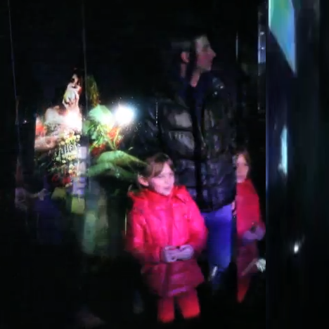 L’installation déploie un dispositif spatial complexe où la multiplicité des interfaces perceptives – vidéoprojections sur un réseau de panneaux mobiles en plexiglas et miroirs sans tain – génère un palimpseste visuel en perpétuelle reconfiguration. Le spectateur, désormais participant, est invité à parcourir physiquement cet environnement où s’entrecroisent des couches d’images projetées et réfléchies, créant une architecture lumineuse en flux constant.