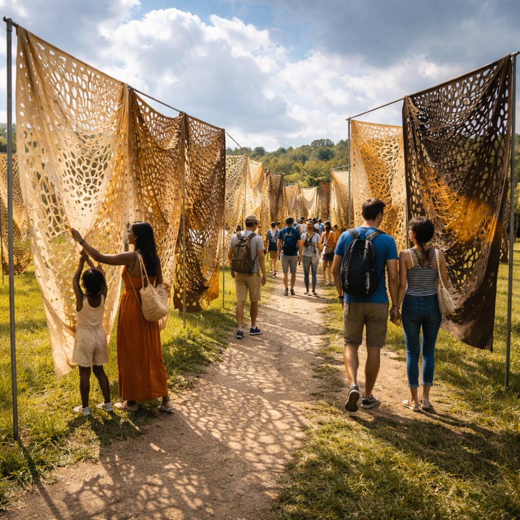 SKIN FLAG, ou les drapeaux de peau entrelacés dans une relation de cuir à peau, déploie une enveloppe animal-organique au-delà des limites et des représentations conventionnelles du corps, prenant ainsi la forme d’un drapeau. Une mise en scène dans divers espaces (publics, patrimoniaux, naturels) crée un nouveau territoire corporel enveloppant le visiteur et l’invitant à questionner sa propre perception.