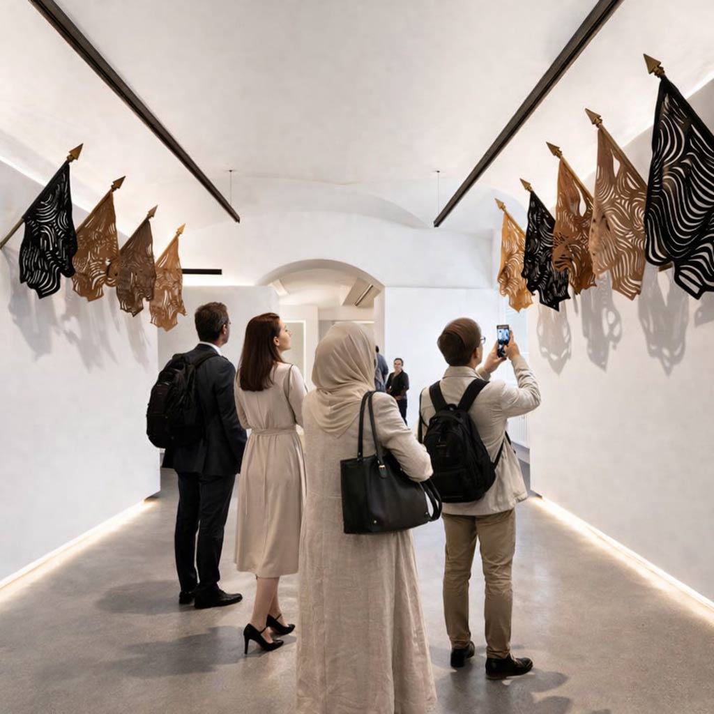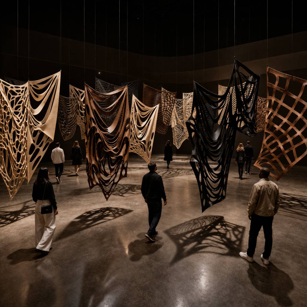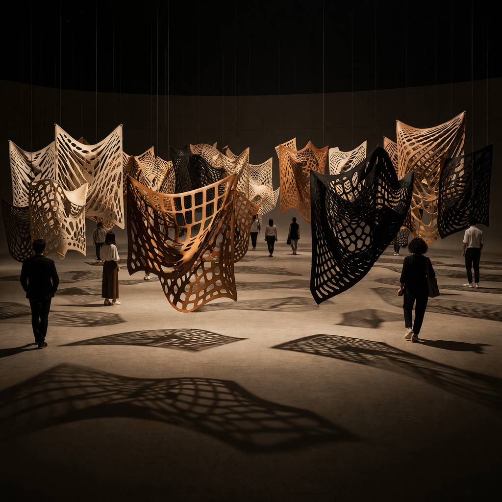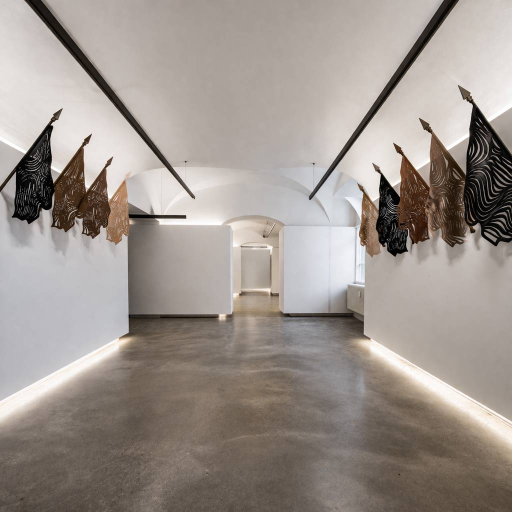 Maquette, simulation numérique d’un avant-projet. Drapeaux en cuir découpés, 2026 © José Man Lius