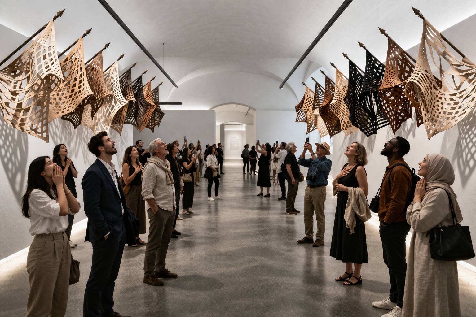 Brandir un drapeau n’est pas un geste anodin, c’est aussi porter le poids des racines, de l’affirmation des victoires et des défaites, de la construction silencieuse de soi, de la charge du passé, des paroles taiseuses, de l’étouffement des peurs, de la libération. La teinte du cuir renvoie à la condition animale mais aussi à la peau humaine. Entre histoires, migrations et barbarie, la peau témoigne des nœuds familiaux et des tensions culturelles.